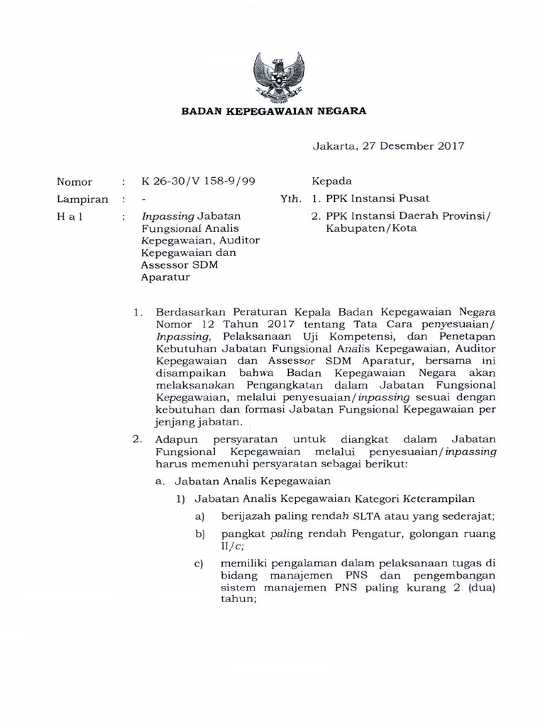 Untuk mengajukan inpassing, ada beberapa persyaratan yang harus bapak/ibu penuhi, yaitu sebagai berikut. Bersama ini dengan hormat kami sampaikan daftar nama calon peserta yang akan mengikuti uji kompetensi penyesuaian/inpassing dalam jabatan fungsional kepegawaian sebagaimana terlampir. Kepada pegawai negeri sipil yang diangkat dan ditugaskan secara penuh dalam jabatan fungsional analis kepegawaian,diberikan tunjangan analis kepegawaian setiap bulan. (info terbaru diperpanjang sampai desember 2021) kita dapat mengajukan ke bagian kepegawaian dan akan diteruskan ke instansi pembinanya (untuk ak adalah lan). Berdasarkan peraturan kepala badan kepegawaian negara nomor 26 tahun 2018 tentang tata cara penyesuaian/ inpassing, pelaksanaan uji kompetensi, dan penetapan kebutuhan jabatan fungsional analis kepegawaian, auditor kepegawaian, dan assessor sumber daya manusia aparatur. Download peraturan presiden republik indonesia nomor 17 tahun 2013 tentang tunjangan jabatan fungsional analis kepegawaian. Tugas pokok tugas pokok analis kepegawaian adalah melakukan kegiatan perencanaan, pembinaan, dan Loncat ke navigasi loncat ke pencarian. Persyaratan inpassing assessor sdm aparatur. Persyaratan keterampilan keahlian keterangan 1. Surat pengumuman hasil inpassing 16 september 2020 analis kepegawaian auditor kepegawaian assessor sdm aparatur Inpassing sesuai definisinya penyesuaian yang terbatas sampai jangka waktu tertentu. Jabatan fungsional analis kepegawaian termasuk dalam rumpun manajemen.